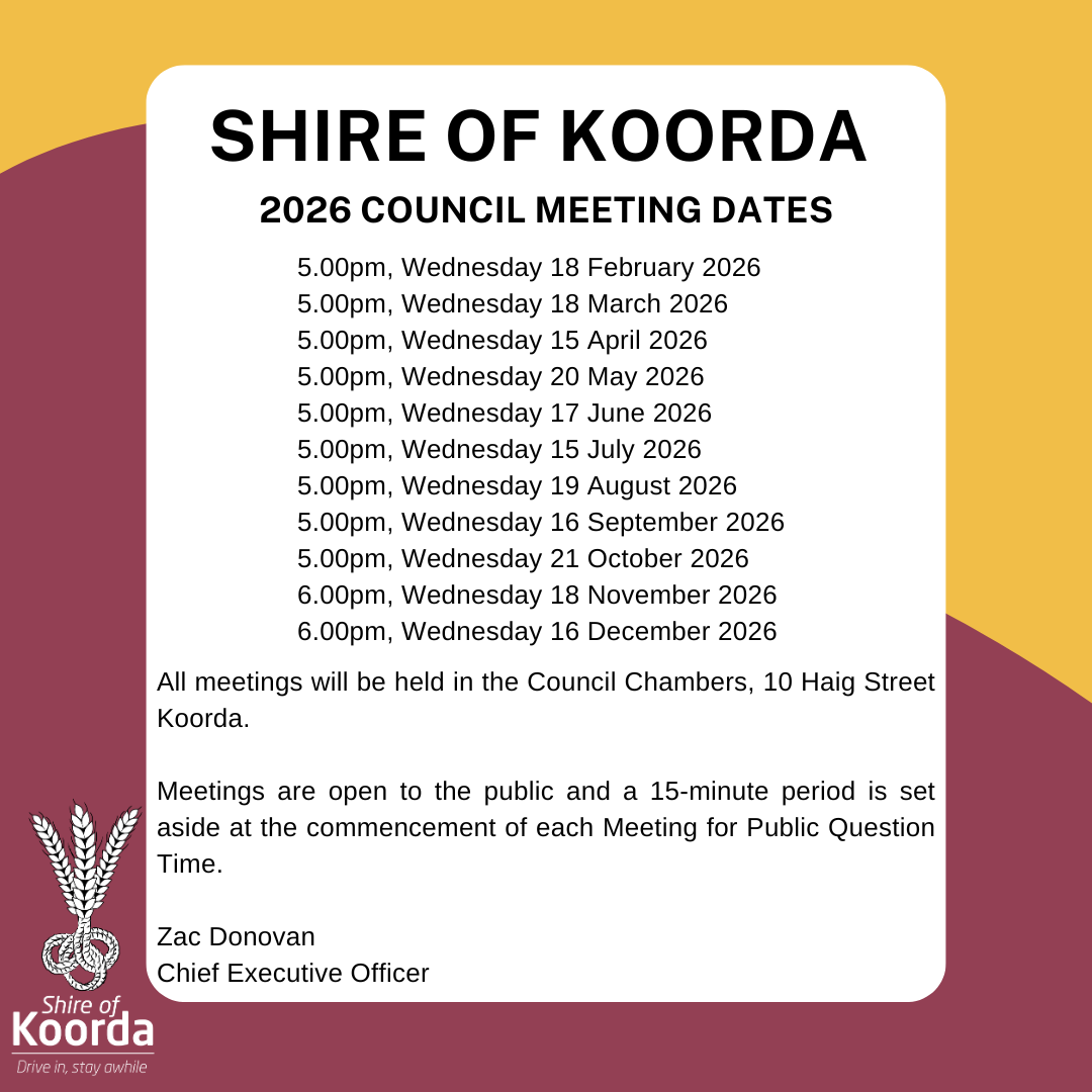 Council meetings will typically be held the third Wednesday of the month (excluding January where no meeting is typically held). Council meetings normally commence at 5.00pm to afford an opportunity for most members of the public to attend after work, with November and December meetings normally commencing at 6.00pm to afford the opportunity for members to attend during the harvest period.