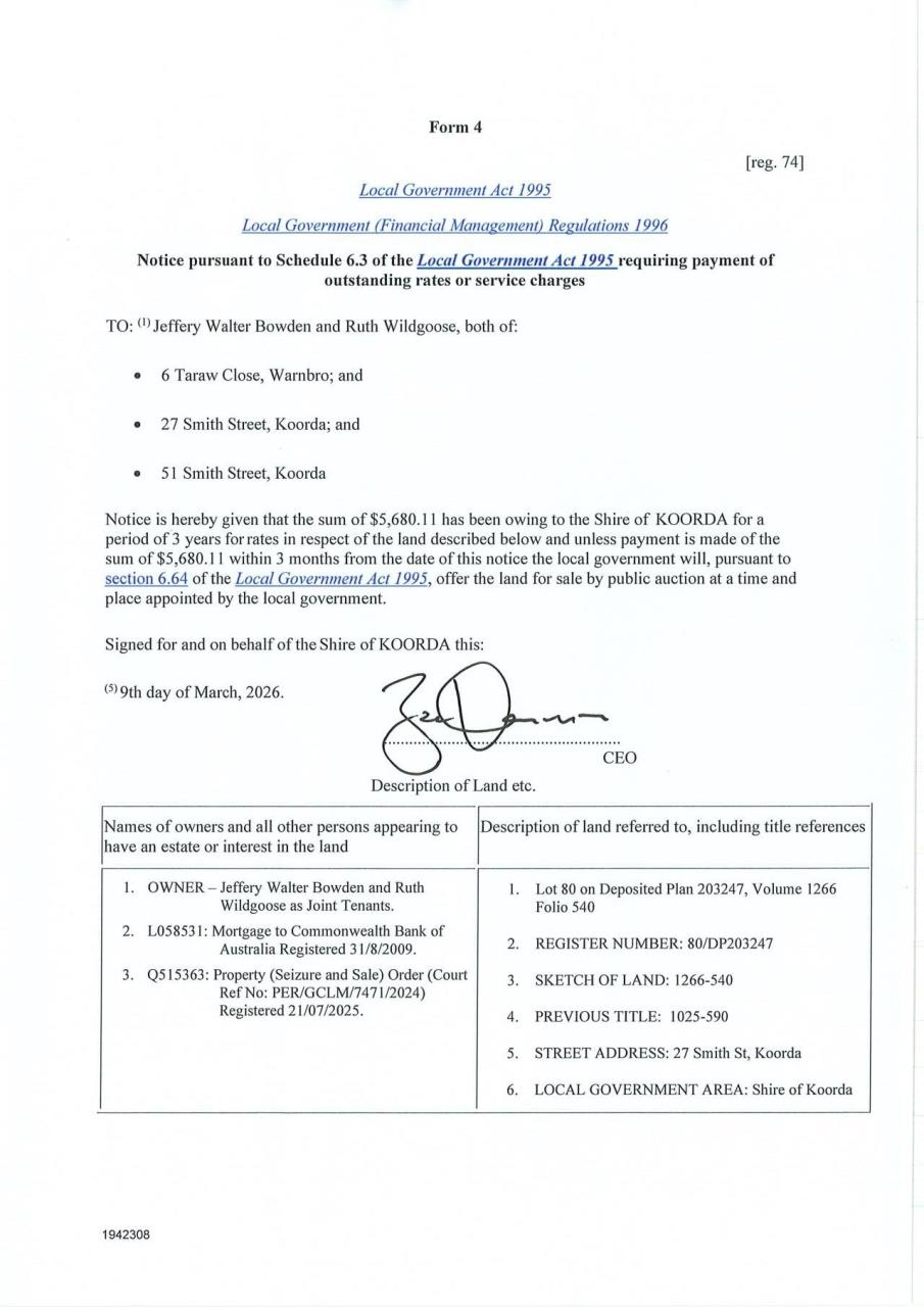 Form 4 Notice pursuant to Schedule 6.3 of the Local Government Act 1995 requiring payment of outstanding rates or service charges - 27 Smith Street Koorda